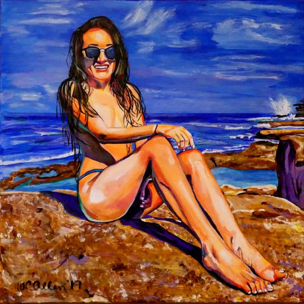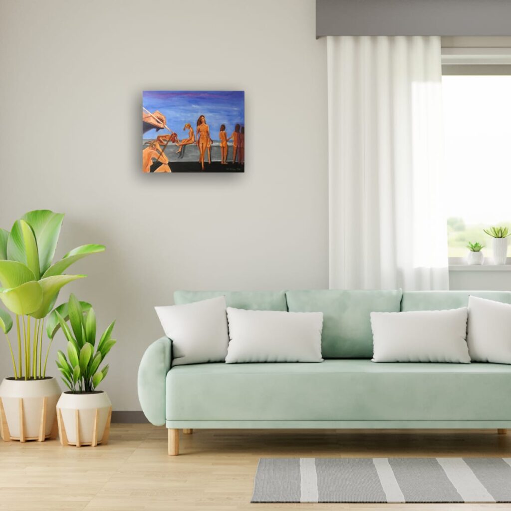 In “Tall, tan, lovely,” the human form becomes a living metaphor for resilience and harmony with nature. The figure stands alone in a sun-washed landscape, her elongated posture and golden skin echoing the upright grace of a tree or dune. The boundaries between body and earth are gently blurred, inviting viewers to reflect on the ways we are shaped by—and connected to—the places we inhabit. This painting is both a celebration of individuality and a meditation on our place within the natural world.